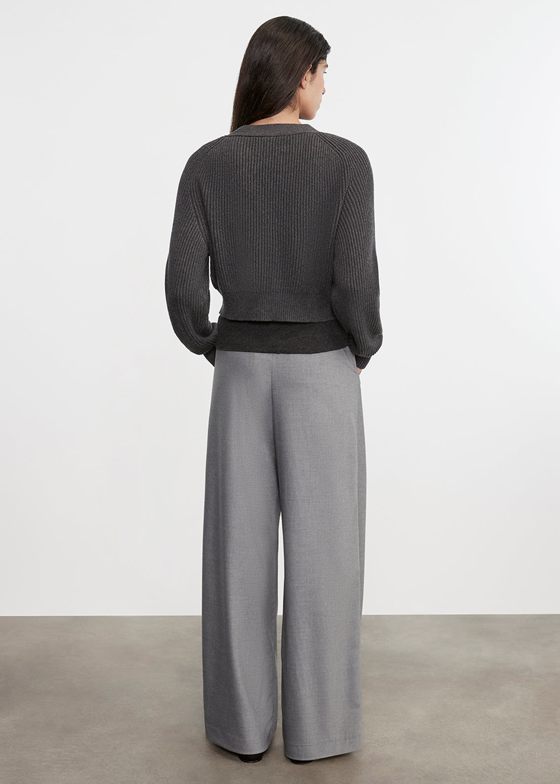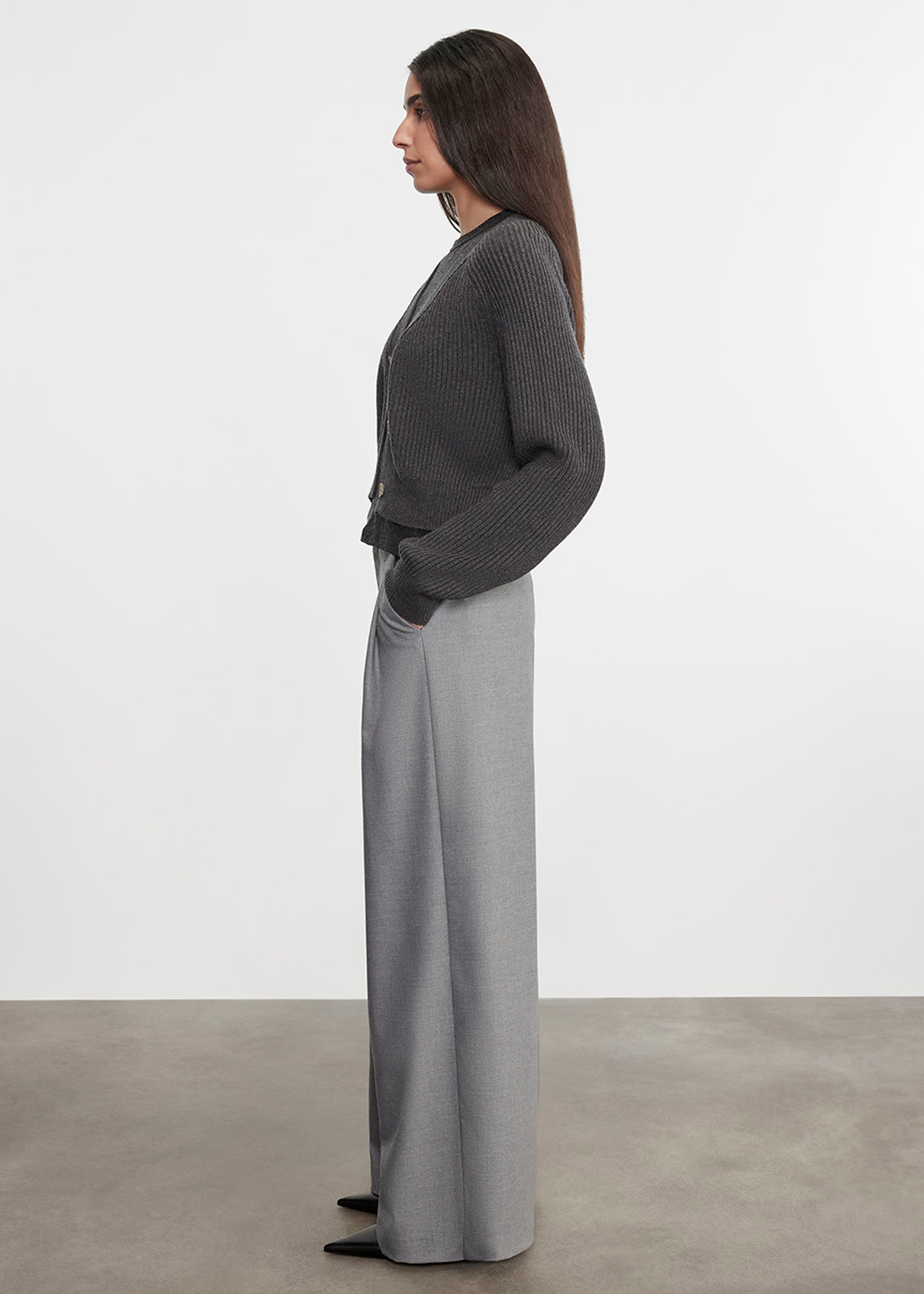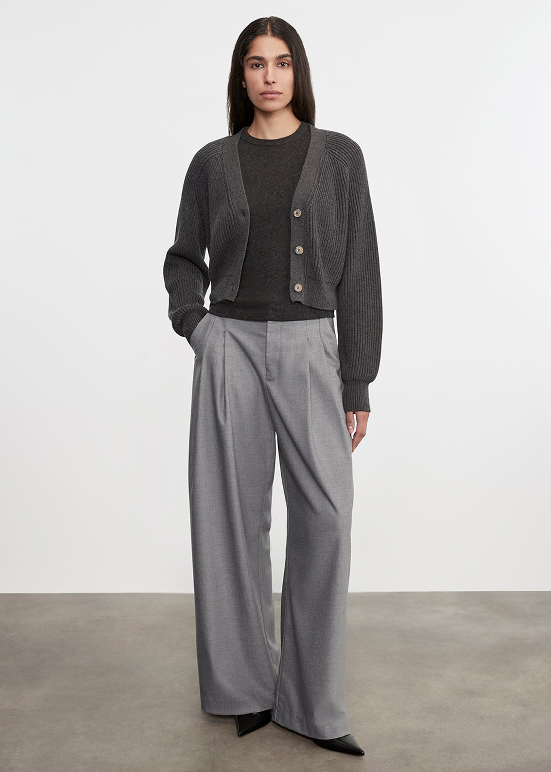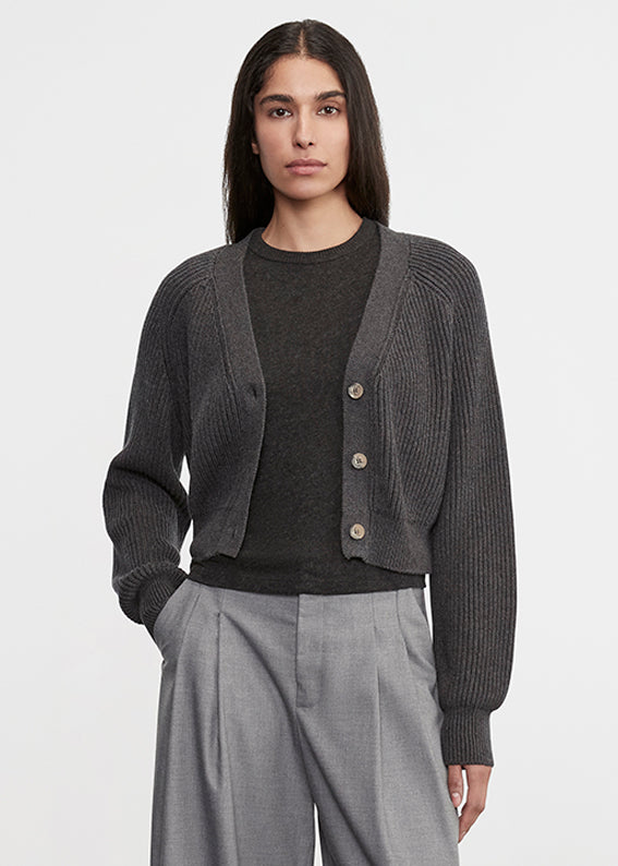 Cropped V-neck cardigan knit in cashmere-cotton blend. Button front closure. Long sleeves with rib cuffs and hem.