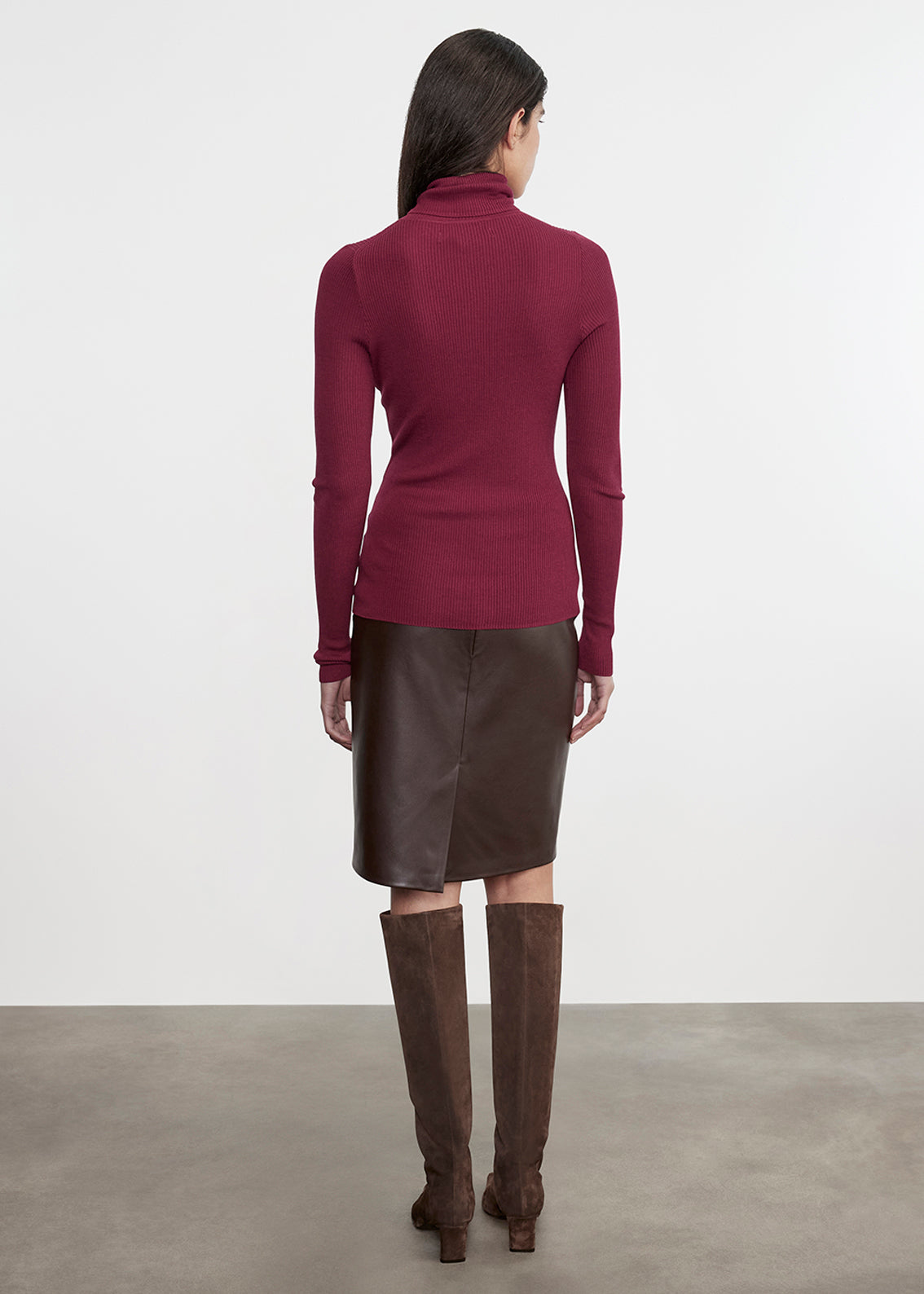 Pencil skirt in luxe stretch vegan leather. Slim fit with a clean waistband, knee length, and a concealed back zipper closure.