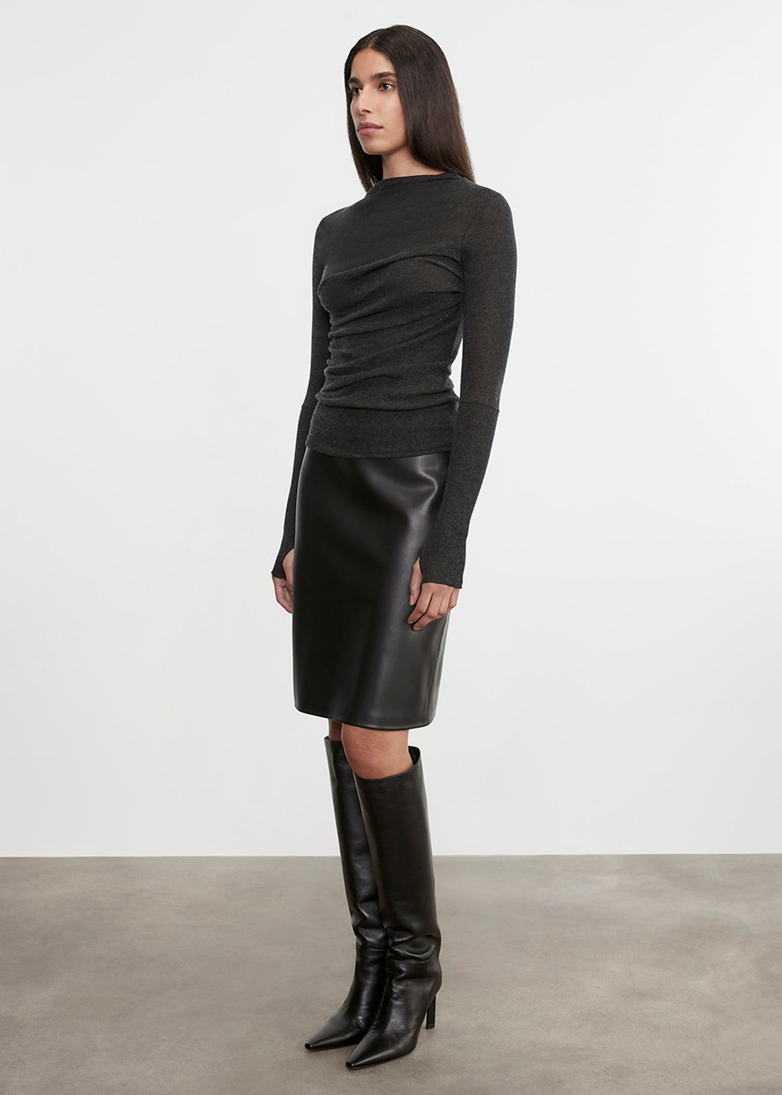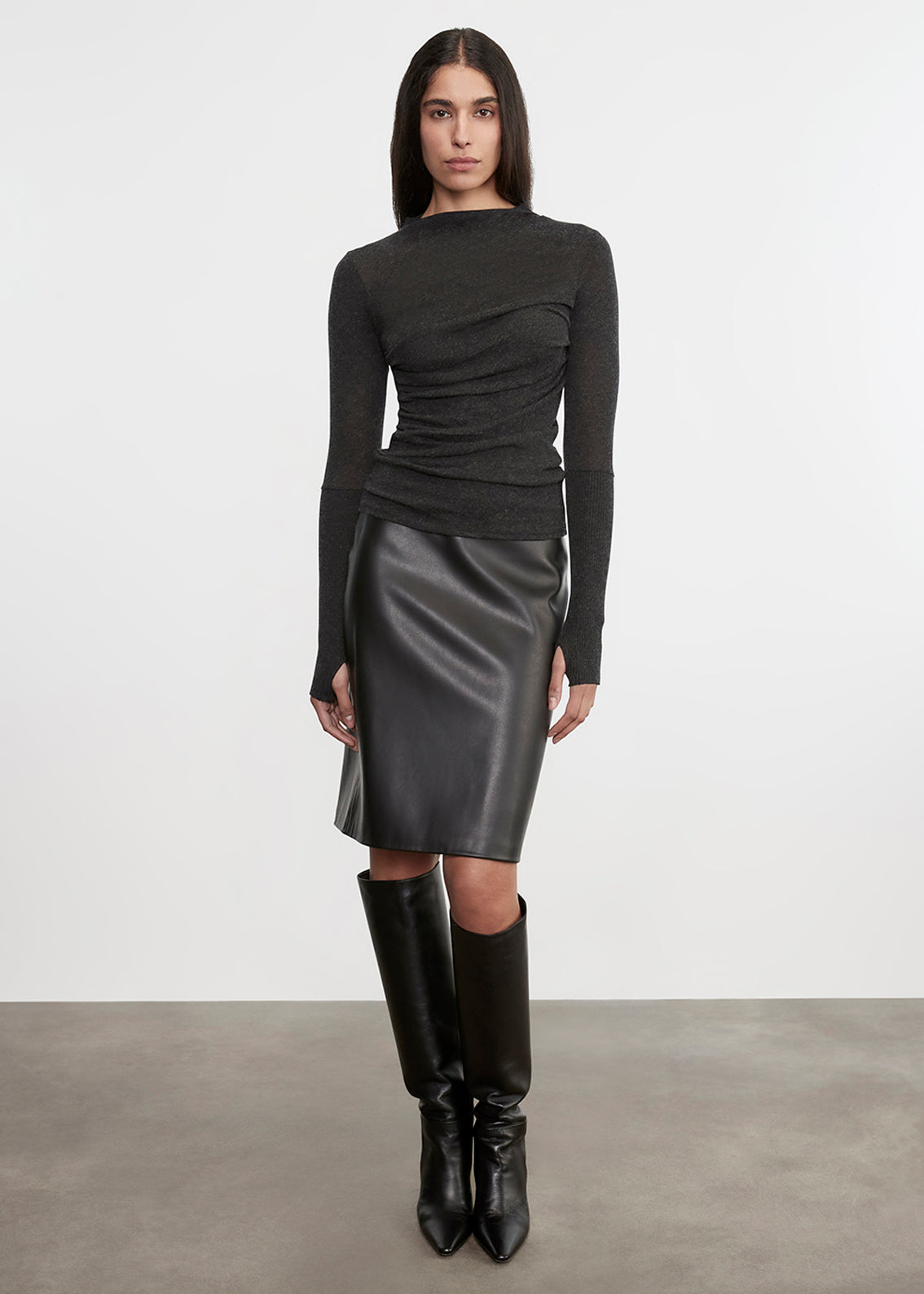 Pencil skirt in luxe stretch vegan leather. Slim fit with a clean waistband, knee length, and a concealed back zipper closure.