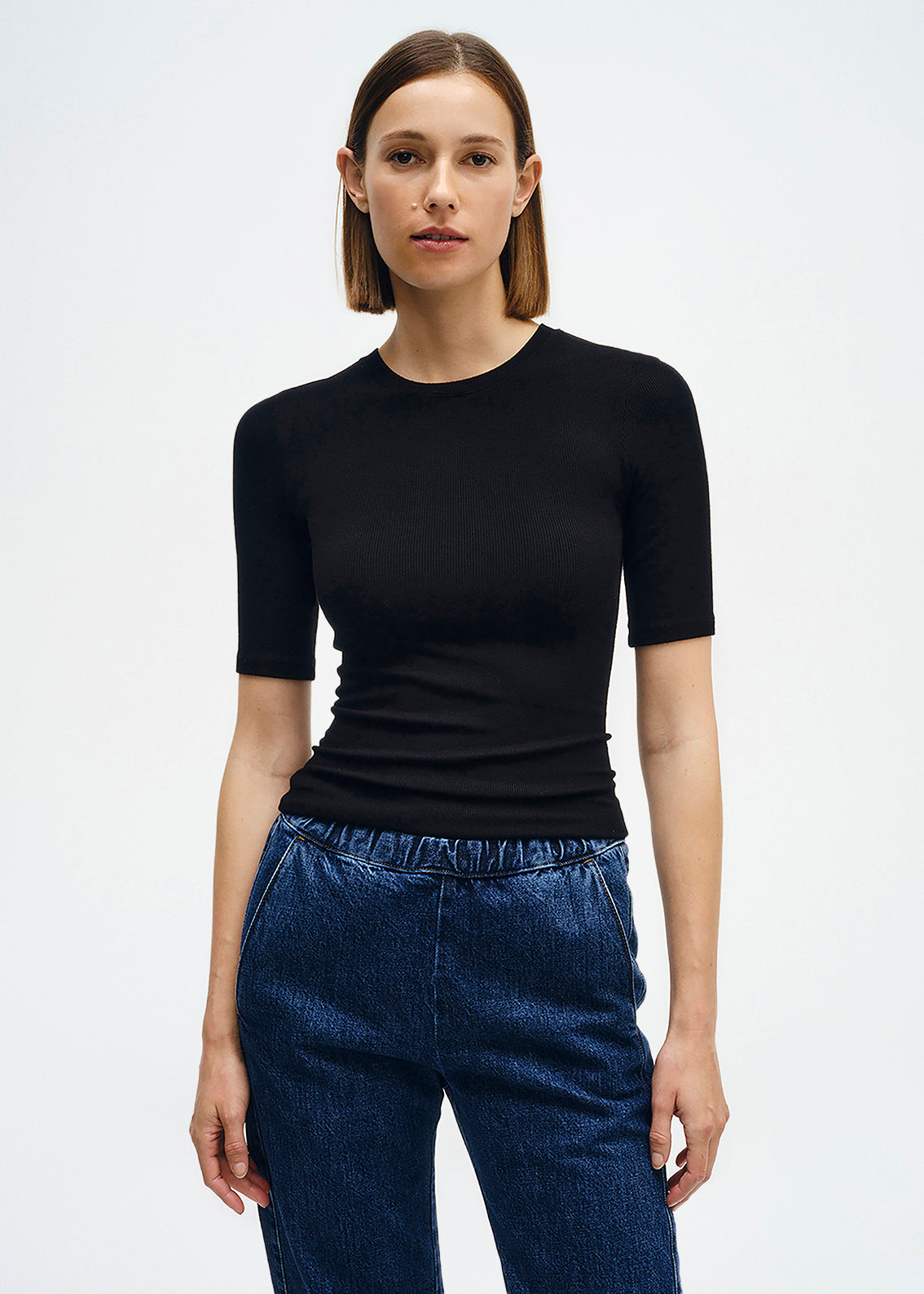 This silk rib top is crafted with the most touchable softness. It offers a body-skimming fit with flattering stretch, featuring the brand's signature center back seam and half sleeve design. A versatile piece, perfect for layering.