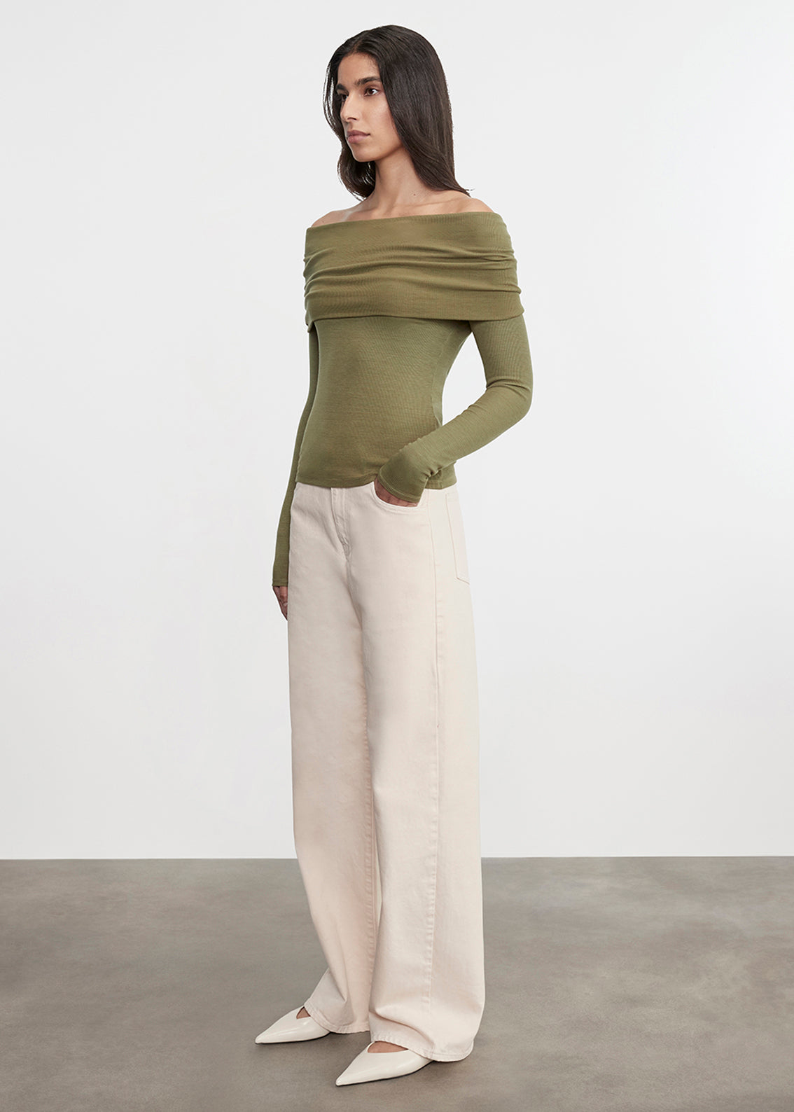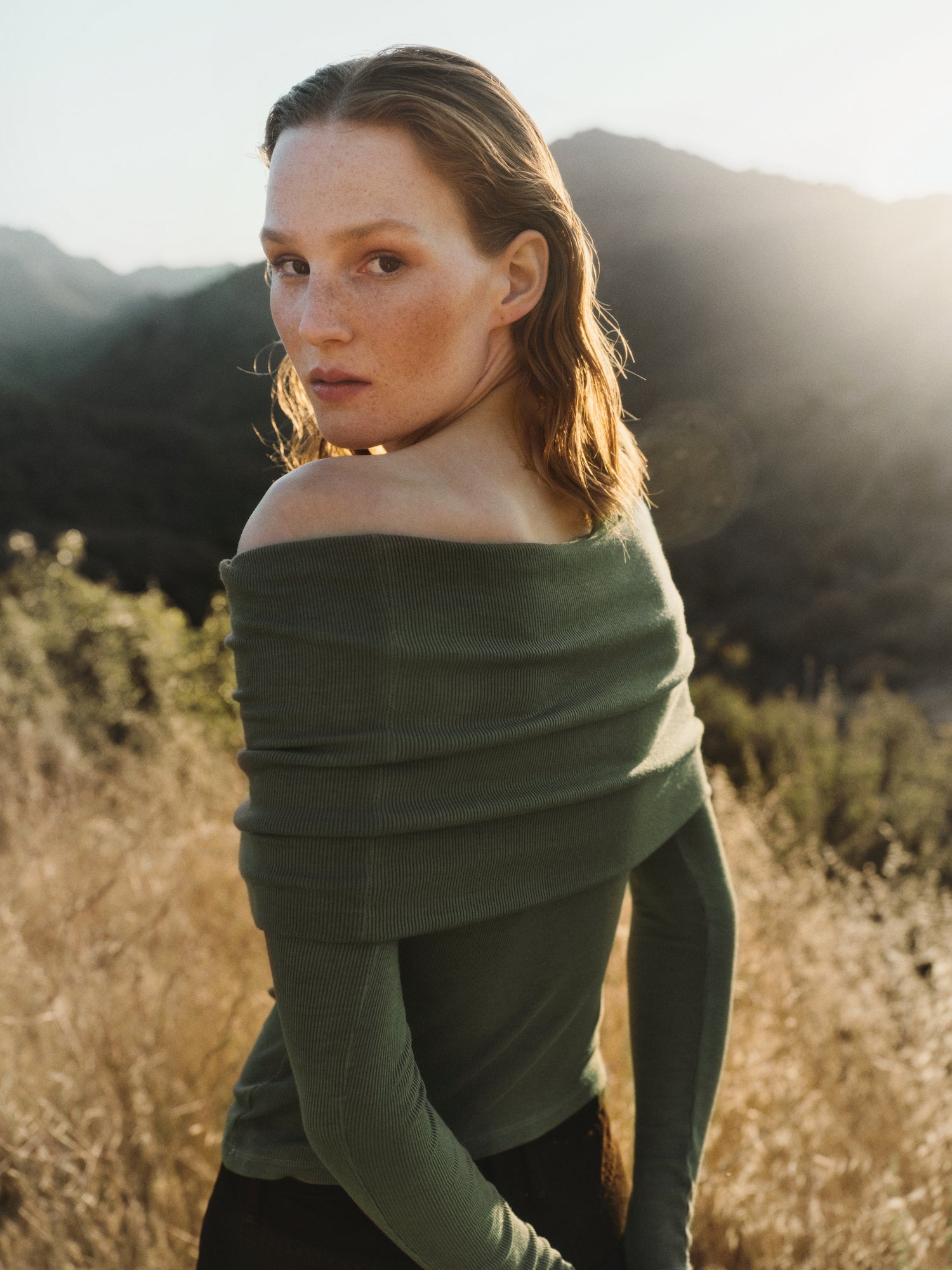 Off-shoulder top featuring a gathered neckline and fitted long sleeves. Made from a signature silk blend for a close, comfortable fit.