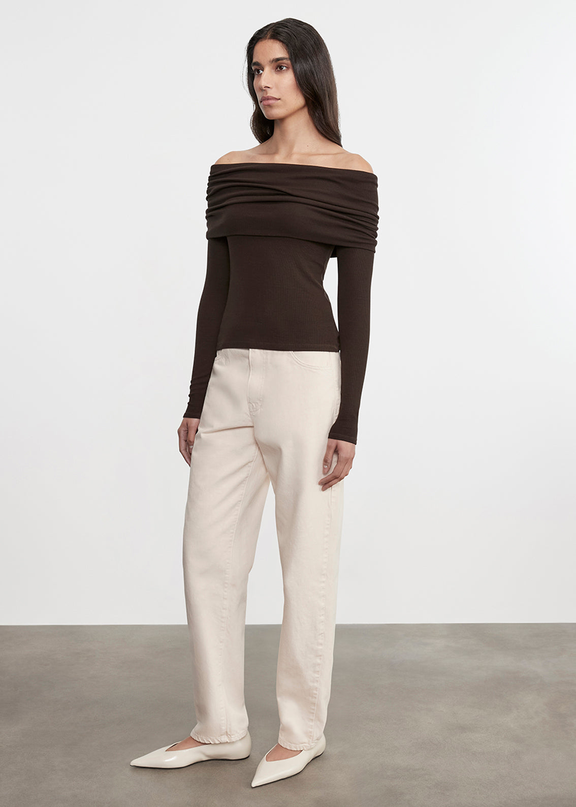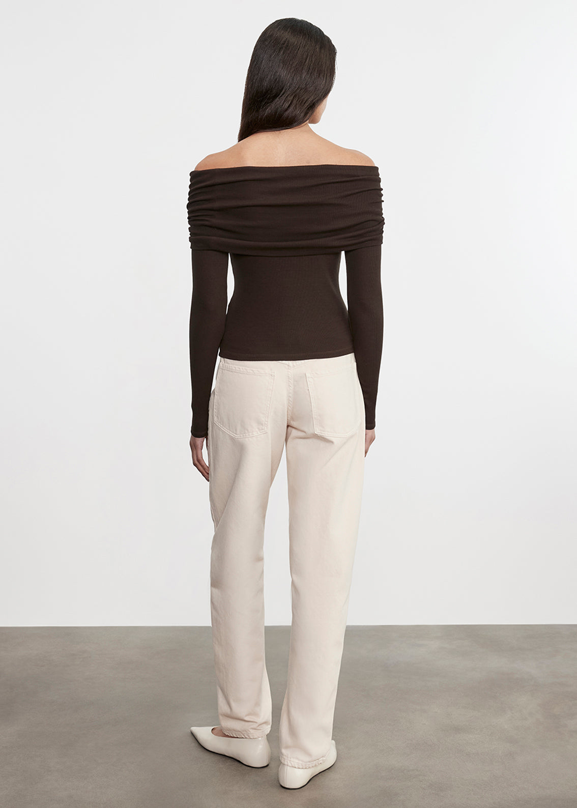 Off-shoulder top featuring a gathered neckline and fitted long sleeves. Made from a signature silk blend for a close, comfortable fit.